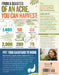 From a quarter of an acre, you can harvest 1,400 eggs, 50 pounds of wheat, 60 pounds of fruit, 2,000 pounds of vegetables, 280 pounds of pork, 75 pounds of nuts.