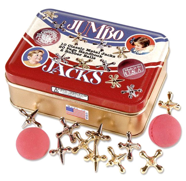 Nostalgic Toy Tins feature classic games from our childhood. 5 Brass and 5 Nickel Jacks, 2 Balls & 20 page Handbook. Specs: 3" x 5" WARNING: CHOKING HAZARD-- Small Parts. Not for children under 3 years.