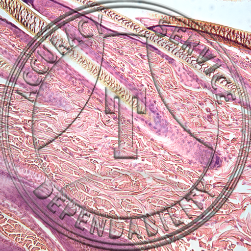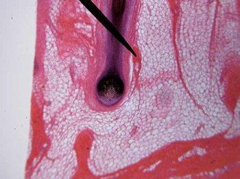 In stockSkin; section with hair follicles cut longitudinally. This slide of Human Skin w/ hairs is used with many biology courses. Each slide is individual...