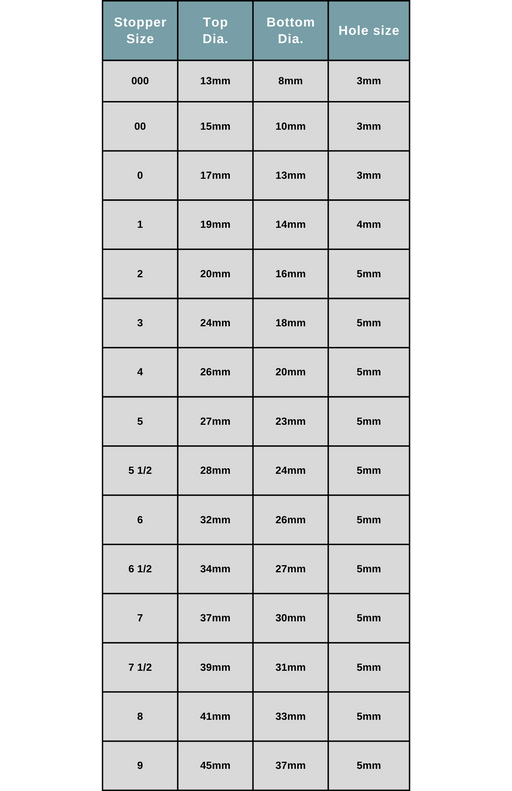 Low stockThese stoppers are size 5 and are drilled with one hole. Size 5 stoppers have top diameter of 27mm, a height of 25mm, and a bottom diameter of 23mm.
