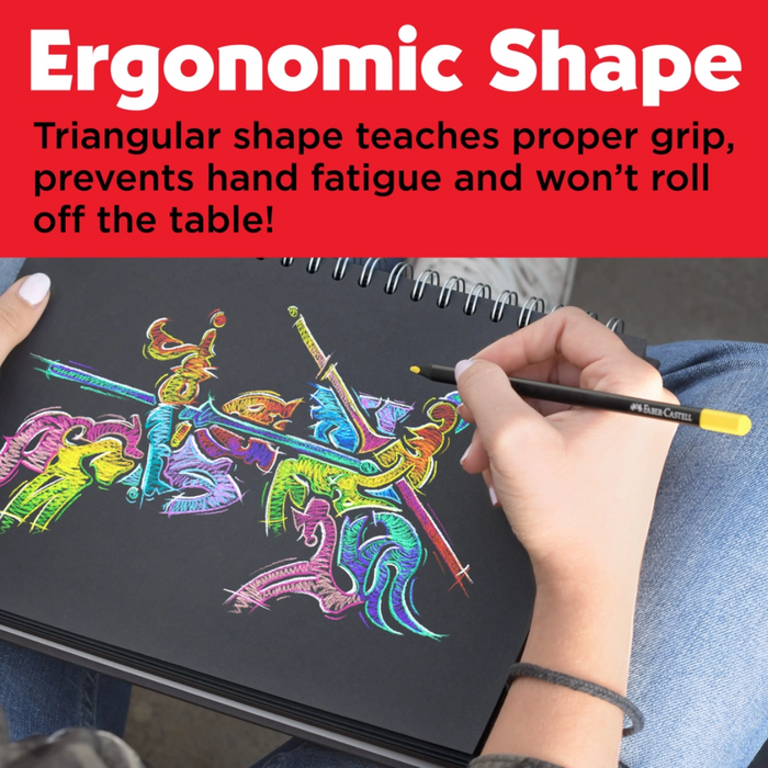 Pure color! The ergonomic triangular shape of the pencils automatically ensures the correct grip position for optimum comfort while drawing and prevents hand fatigue when creating art. Pencils will not roll away from the work surface as well.