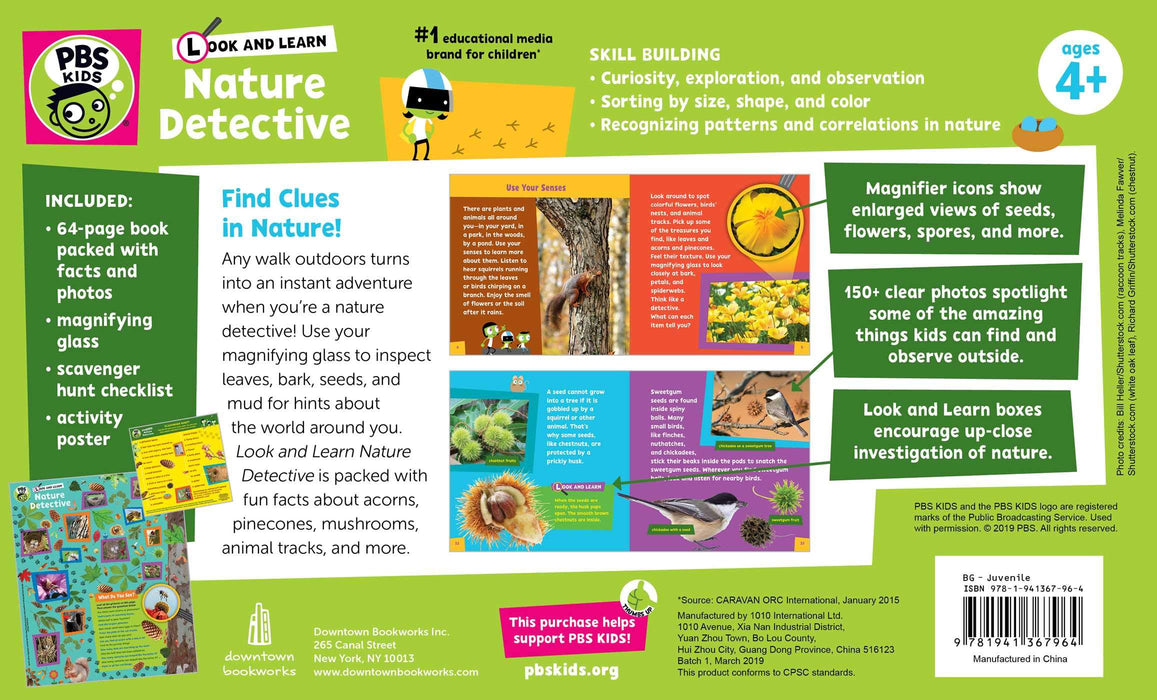 Armed with a magnifying glass and an innate sense of curiosity, any child can be a nature detective! PBS Kids Look and Learn Nature Detective is packed with pictures and simple information to encourage kids to go outside and explore—to look at leaves, nuts, seeds, bark, pine cones, mushrooms, animal tracks, and more. The kit encourages children not only to notice interesting items around them, but to inspect them up close—to touch and feel for texture and to compare and contrast their shapes, colors, and sizes. The book also encourages children to notice the amazing sounds, smells, and sights on any nature walk.