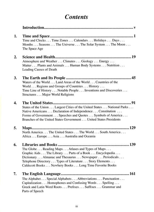 Newly revised! A user-friendly almanac of fast facts for students, parents, and teachers. Thirty-eight hundred entries of fascinating facts, illustrations, charts, and maps to spark student interest. Major sections include: Time & Space, Science & Health, The Earth & Its People, The United States, Maps, Libraries & Books, The English Language, Writing, Music, Art, Math & Numbers, Handbook... and so much more. 250 pages, paperback, 8 1/2"x11".