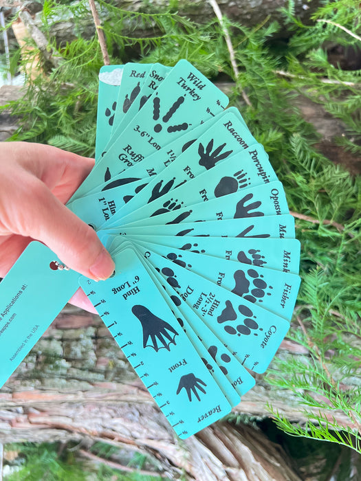 Each of the tags, measuring just 1¼” x 4”, are bound together on a ball chain and fan out easily for quick comparison. The side of each tag is equipped with a ruler to aid in identifying the size of the track – an important step in determining the difference between some animals, such as a fox and a coyote.