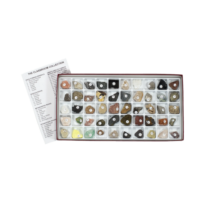 Includes 50 specimens (approximately 1") in a compartmentalized box. Includes specimens from the following groups: igneous, sedimentary and metamorphic rocks; ores, gemstones, and minerals in the scale of hardness. Numbered specimens are keyed to study sheet and a Rocks and Minerals Study Guide is also included.