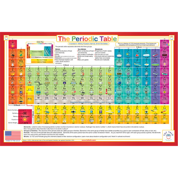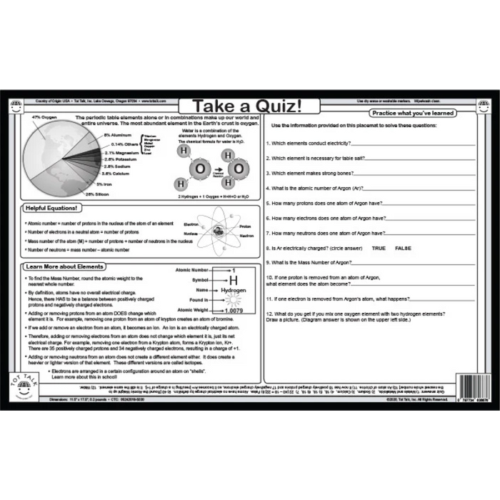 For any budding scientist, this is a great placemat to have on your table every day. Or, hang it on your wall! Learn about the periodic table and the 118 elements. Take a quiz and memorize useful equations on the back side. Covers chemistry essentials like: How to find the Mass Number; What happens when you remove a Proton from an Atom; What is the Atomic Number: and much, much more! Recommended age: 6 - 100+.