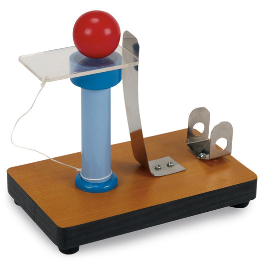 A 3/4" steel ball rests on a cardboard square lying on a 3" vertical post. When a spring is released, it shoots the square out and the ball falls into a concave recession in the post. (It reminds us of the old "pull-the-tablecloth-out-from-under-the-dishes" trick!)