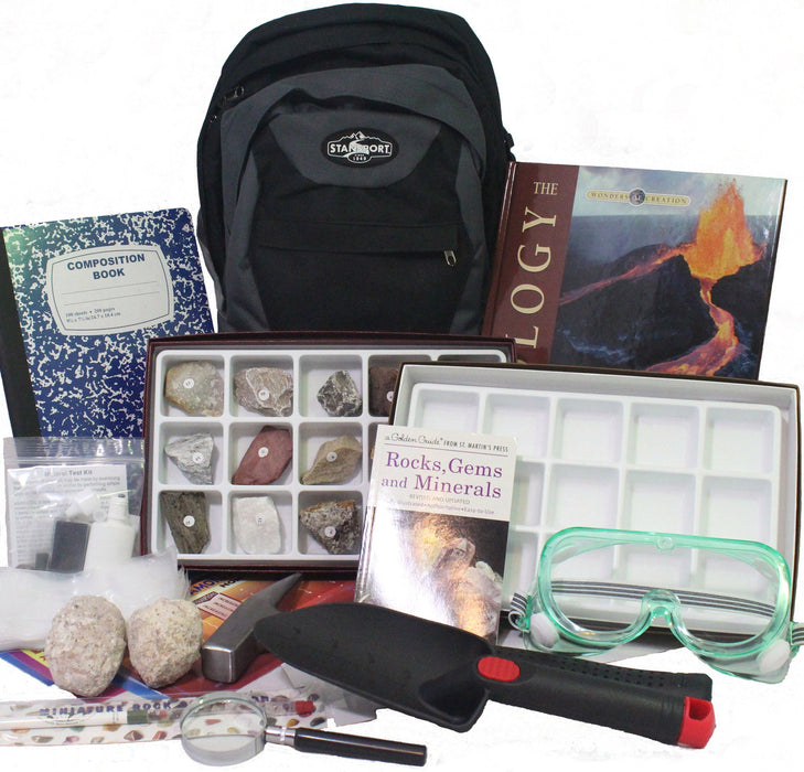 Encourage your explorer to make discoveries in the exciting world of Geology! This kit includes: The Geology Book (written from a creationist perspective) and a Rocks, Gems, and Minerals field guide which will guide your explorer through exciting activities and observations. It also comes with a rock pick, safety goggles, a Rock & Mineral Test Kit, two large geodes for discovery, rock collection pencil, Rock & Mineral Display box, specimen collection bags and labels, 15-specimen rock collection, magnifier, trowel, observation notebook, and an explorer backpack.