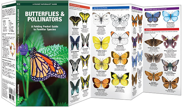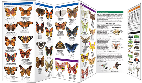 Some of the most vibrant colors and patterns in the Animal Kingdom are found among butterflies. Gawdy swallowtails, exquisite gossamer-wings, and a multitude of eye-catching brushfoots are particular standouts, though plenty of whites, sulphurs, metalmarks, and skippers are also adorned with splendid markings. Flowering plants across North America attract some 700 butterfly species as well as thousands of moths, bees, wasps, flies, and beetles, not to mention some hummingbirds and bats. The portable reference is a handy tool for those wishing to deepen their understanding of butterflies and other colorful pollinators. It features beautiful illustrations of 70 familiar butterflies and moths as well as some especially common larvae and pupae. Also included are notes on life cycles and other common pollinators. Laminated for durability, this lightweight, 12-panel folding pocket guide is a terrific resource for educators, learners, naturalists, and gardeners. Made in the USA.