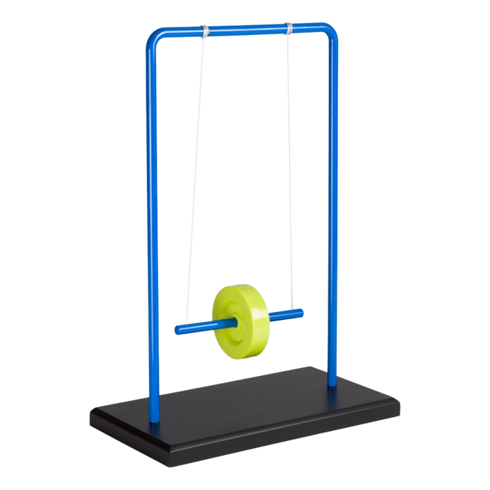 Project Blueprint's Maxwell's Wheel is fidget-friendly and desktop-fashionable. Stands 10 inches tall with black, blue and green coloring. An oscillating flywheel provides a yo-yo-like motion when engaged. Scientifically inspired for tactile and visual delight. Made with high-quality materials, this desktop toy features a smooth black base, blue stand and wheel pole, a lime green flywheel and white string.