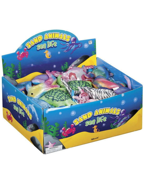 These sea animal cloth toys are stitched from beautiful shimmering fabric and filled with sand. Sold individually in one of 6 assorted styles (shark, octopus, sea horse, crab, dolphin and turtle).