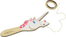 An old fashioned toy that is fun and challenging, the Unicorn Ring Toss is crafted from high quality birch plywood, sanded with gently rounded edges and finished with a teak oil. The Unicorn measures about 0.25" thick and 9" long. Colorful printed graphics on both sides. The ring is 2" in diameter and the string is 12" long. Can you get the ring on the horn?? The unicorn is the most challenging of the three designs.