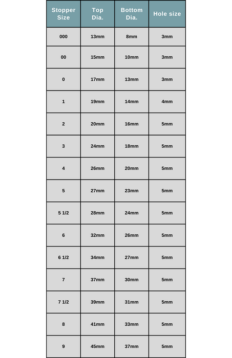 These stoppers are size 00 and are drilled with one hole. Size 00 stoppers have top diameter of 15mm, a height of 25mm, and a bottom diameter of 10mm.