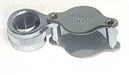 Nickel-plated case which slides into nickel-plated brass body. Magnifies 16x, lens is 20mm across.