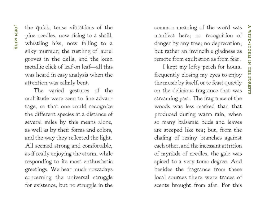 In this essay from 1894, Muir describes the grandeur of the winds at play in the forests, with stunning and musical detail about the trees of the Sierra and their individual reaction to the wind. Muir's story of climbing a 100-foot Douglas Spruce to experience the sway and swirl of a storm for himself is unforgettable.