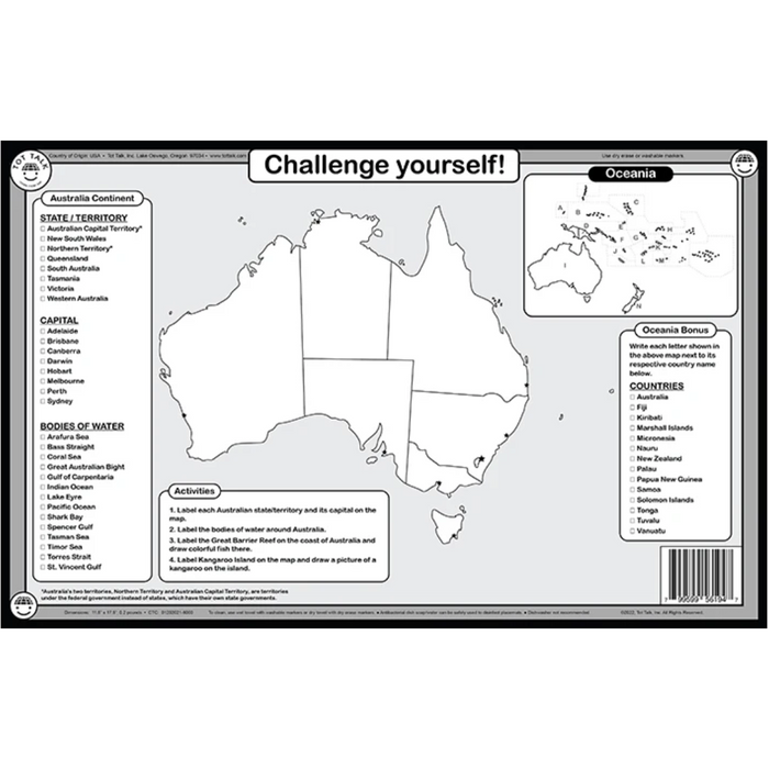 Learn about the continent of Australia with Tot Talk's made in the USA, durable, double-sided, educational placemat. Explore Australia's states and territories and their capitals, as well as the major bodies of water. A bonus feature includes the bigger region of Oceania and its 14 countries, including New Zealand, which is not part of Australia's continent. Test your knowledge on the back side by filling in country names, capitals, and bodies of water in their respective locations. Adults and kids will learn!