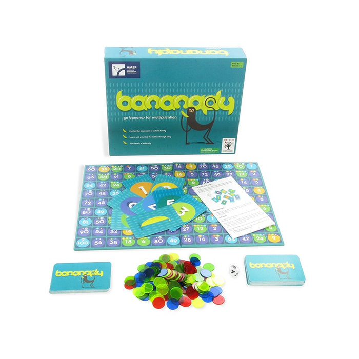 Multiply the roll of a die with one of your cards to place your chips on the numbered board. Get six chips in a row to win! With two levels of difficulty, this game is ideal for the beginner or expert multiplier. So grab your fellow monkey and truly go bananas for multiplication!
