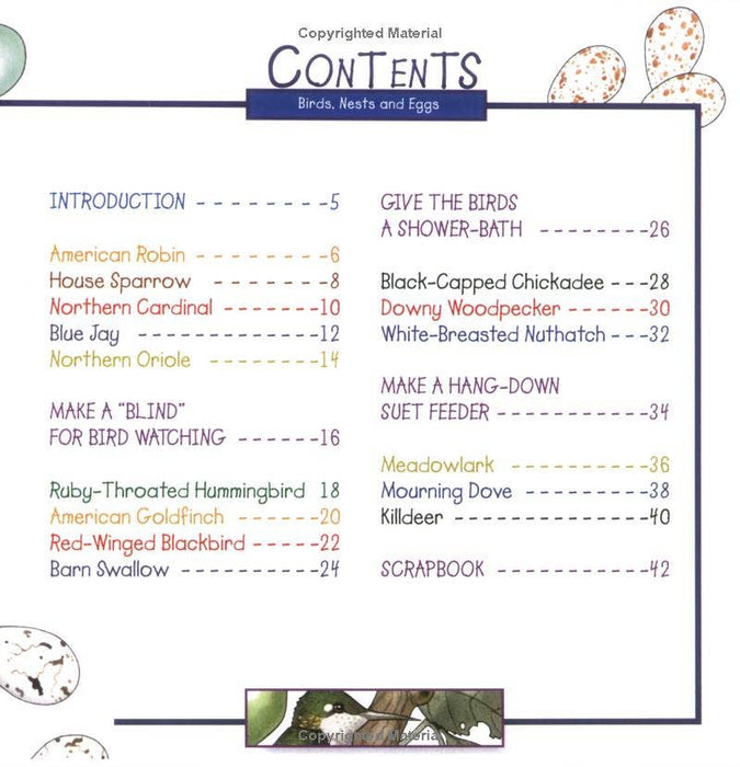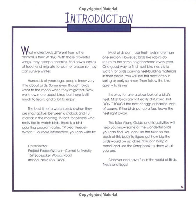 A fun, informative take-along guide that will help children identify 15 birds. Kid will also learn how and where birds build their homes and all about their young. Plus the guide features activities that are fun and easy to do. There's also a seven-page scrapbook for drawings and notes.Invites young naturalists to spot wildlife. Safety tips are provided and interesting activities are sugested. Color illustrations enhance the presentation. —-HORN BOOKS (Tracks, Scats and Signs)