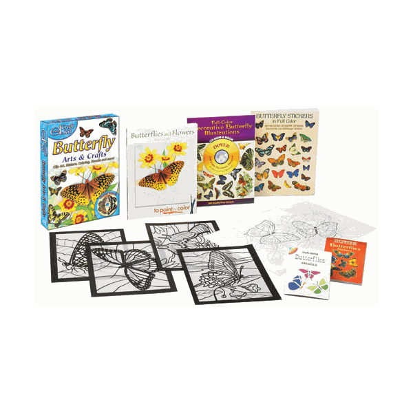 Enhance your projects with this value packed collection of butterfly fun. Included in this substantial kit are four stained glass coloring sheets, over 100 butterfly stickers, 6 butterfly stencils, an 11"x 16" butterfly poster, and the book Butterflies and Flowers to Paint or Color. An added bonus is a CD-ROM containing 388 beautiful images for arts and crafts projects. Packaged in a decorated cardboard box. Makes a terrific butterfly gift!