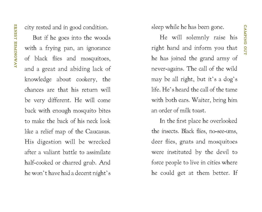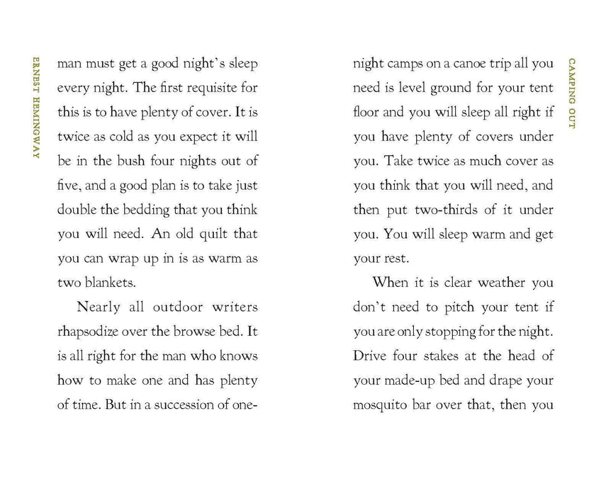 In this piece from 1920‚ originally published as a newspaper article in the Toronto Daily Star‚ young Ernest Hemingway provides solid advice to the novice camper. In his typically succinct style, Hemingway gives tips on bug avoidance, bed preparation, and offers expert outdoor cooking instructions. Any city man enjoying an open-air vacation who follows Hemingway's advice "ought to be able to sleep comfortably every night, to eat well every day and to return to the city rested and in good condition."