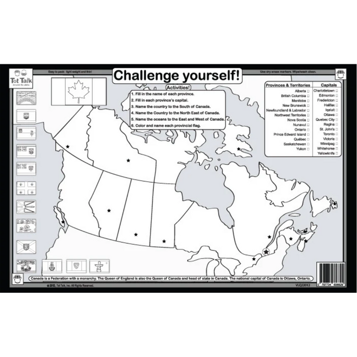 Learn about the beautiful country of Canada with Tot Talk's Canada Activity Placemat. The placemat highlights Canada's 10 provinces and three territories, the capitals and cultural icons that represent each area. Children can test their knowledge of provinces and capitals on the back side. Recommended age: 5 - 100+.