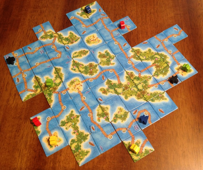 Carcassonne: South Seas keeps the familiar tile-laying gameplay of the original Carcassonne, with players adding a tile to the playing area each round and optionally placing a token on the tile to claim ownership of...something. Instead of the familiar cities, roads and farms, however, players in Carcassonne: South Seas use their meeples to gather bananas, shellfish and fish, then ship those goods to traders in exchange for points. Carcassonne: South Seas is the first game of a new series titled "Carcassonne Around the World".