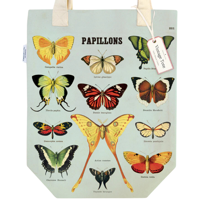 Butterflies Vintage Tote Bag features beautiful vintage butterfly imagery on a light blue background. A selection of butterflies, complete with scientific names, adorn this tote bag.