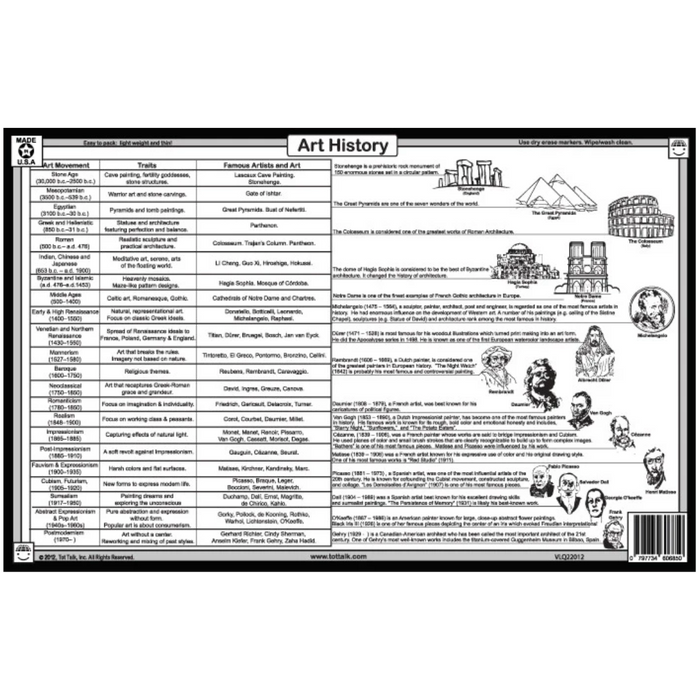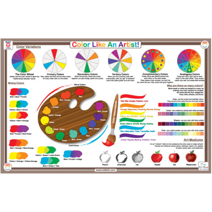 For anyone at all interested in art, color, and art history, we highly recommend Tot Talk's Color Like an Artist placemat. Learn all about color with this vividly colorful placemat! The details of how colors are created are described and shown. Children will learn more about the color wheel and complimentary colors and hues and tones and art mediums. On the back side, children can explore art history and famous art and artists throughout our time from around the world. Parents will learn too. Recommended age: 4 - 100+.