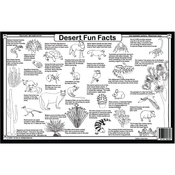 The desert has so many secret gems and sometimes you need to be a detective to uncover all the living species and plants in it. Tot Talk's desert placemat highlights many different cacti and animals of the desert. The back side explains interesting facts about how these amazing plants and animals survive there. Recommended age: 3 - 100+.
