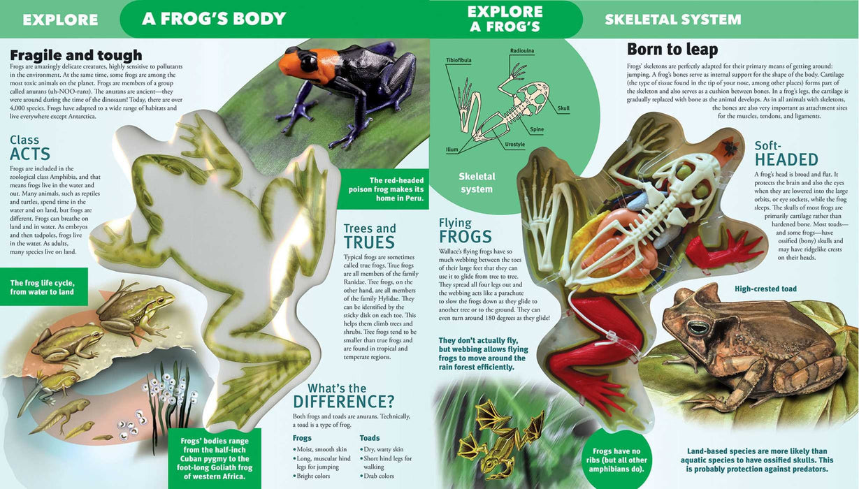 Frogs swim, they leap, they hop, and some can even fly. There are poisonous frogs, hairy frogs, singing frogs, albino frogs and even glass frogs with translucent skin you can actually see through! Uncover the secrets of this amazing animalthat’s anuran to you frog specialistslayer by layer, in this new title in the popular Explore series. Young frog fans will love dissecting all the weird and wild facts, cool illustrations and diagrams, and unique 3-D layered model of a frog. With every turn of the page, the frog is deconstructed before their eyes, as the model demonstrates the hidden workings of the frog’s body. Perfect for curious kids, ages 8 and up.