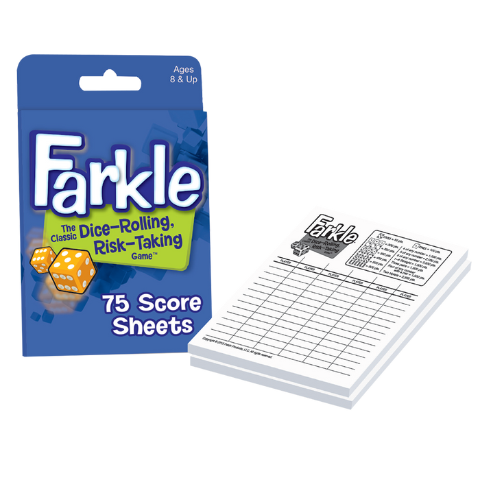 Keep the Farkle fun rolling with this pad of Farkle Score Sheets! Whether you play the Farkle in the famous burgundy box, the full-size Farkle dice cups or the exciting new Farkle Frenzy™, these score sheets will make playing and keeping score easier with the neat lines and columns. Each sheet also features the scoring combinations for reference, and you can keep track of up to five players’ scores on each side of the sheets.