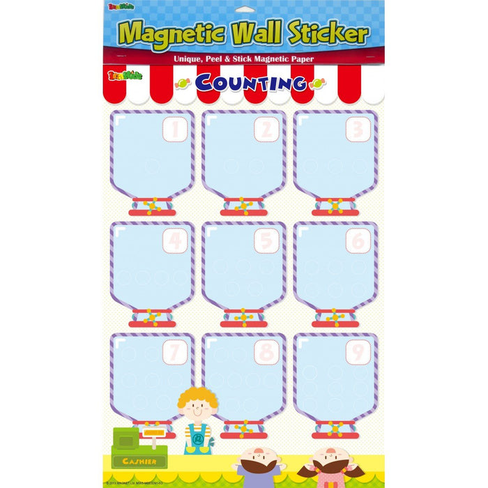 Counting has never been sweeter! This Magnetic Wall Sticker uses brightly colored candy magnets and jars to reinforce counting up to nine. Includes Wall Sticker, 90 magnetic pieces, and mounting instructions.
