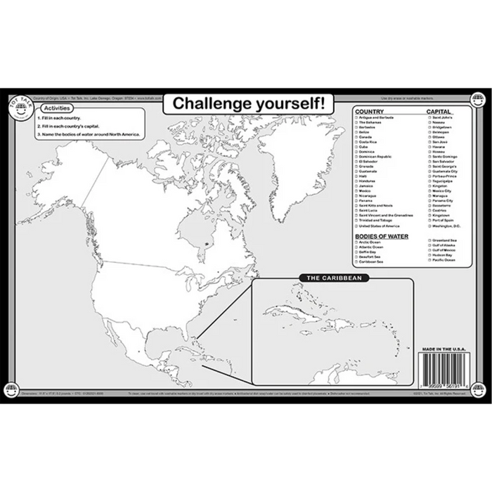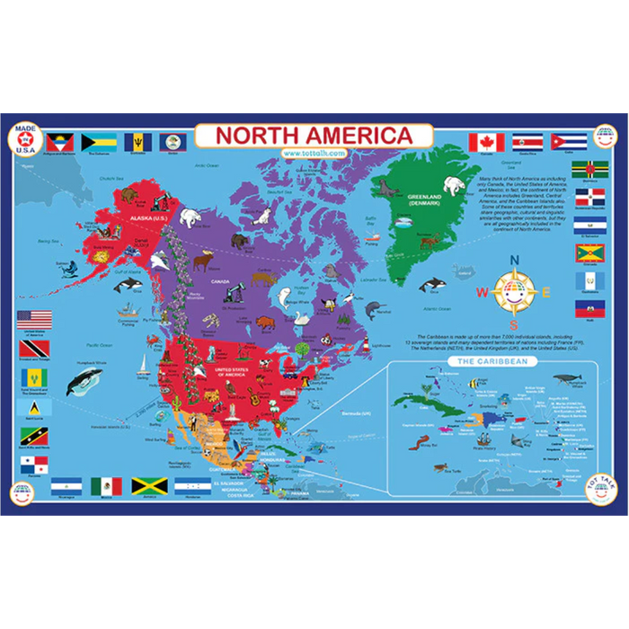 North America is a vast continent that includes not only Canada, the United States and Mexico, but also Greenland, Central America, and the Caribbean Islands. Some of these countries and territories share geographic, cultural and linguistic similarities with other continents, but they are all geographically included in the continent of North America. Explore the entire North American continent and it's unique countries, cultural and geographical landmarks, capitals, natural wonders, flags and more. Test yourself on the back side by filling in country, capitals, and bodies of water names in their respective places. Adults and kids will learn! Recommended age: 4 - 100+.