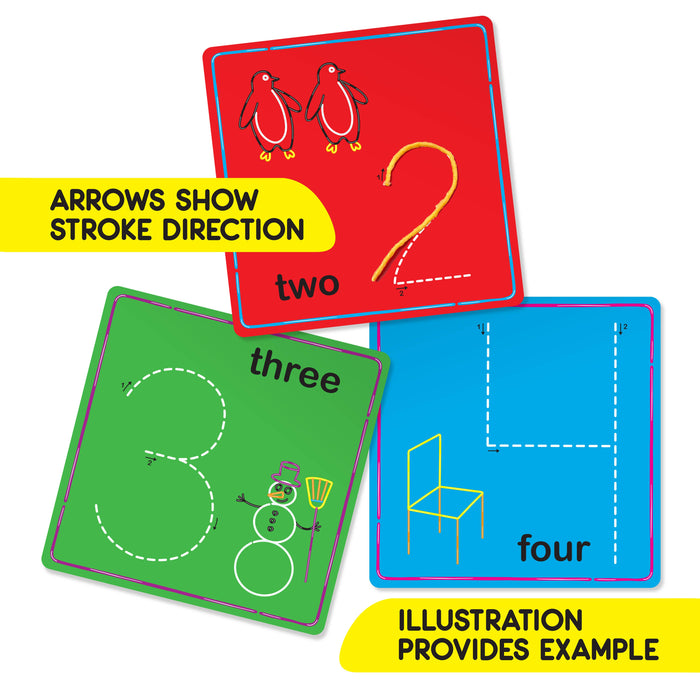 Sturdy reusable counting cards show each number in traceable form for use with Wikki Stix…hands-on, tactile learning. Can be used as flash cards and for simple math activities.