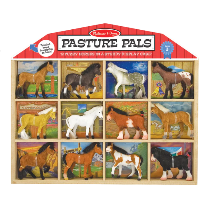 Little ones can have hours of fun as they imagine all kinds of adventures with this adorable Pasture Pals play set. It includes 12 different kinds of horses that feature a velvety texturing, plus realistic manes and tails! Each horse fits snuggly within the compartments in the wooden barn-shaped crate, making storage and cleanup are a breeze. The crate features horse-themed artwork and can be used as part of their adventures and pretend play. The horse play set also includes an informative breed identification key so you can engage with your kids as they learn about the different types of horses. Each horse is sized just right for little hands. So many kids love horses and this makes an exceptional gift for kids ages three and up. From classic wooden toys to realistic pretend play sets, Melissa & Doug products spark imagination and wonder through screen-free, open-ended play!