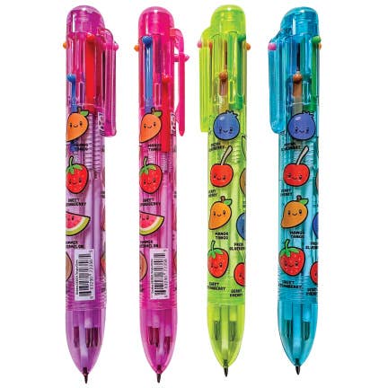 6 pens in 1, that are cute and super fun! Each pen features adorable Kawaii style fruit on the translucent barrel. 4 translucent pen colors: pink, blue, green and purple. 6 ink colors/scents: blue (blueberry), green (watermelon), pink (strawberry), red (cherry), orange (mango), and brown (coconut). Retractable, ball-point. Retractable. Easily change colors by sliding down switch.