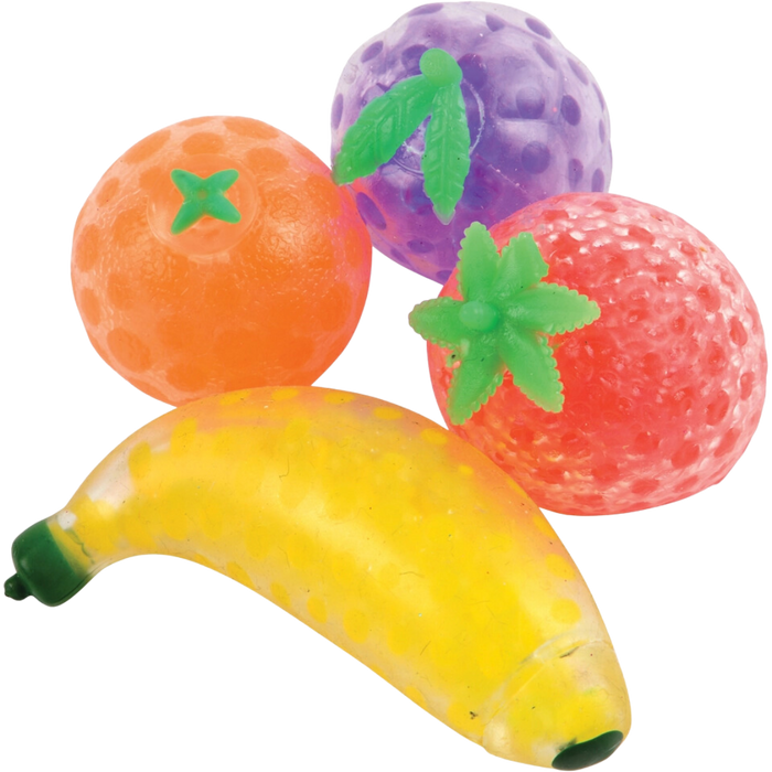 Stretchy squishy fruit shapes, filled with water beads. Sold Individually.