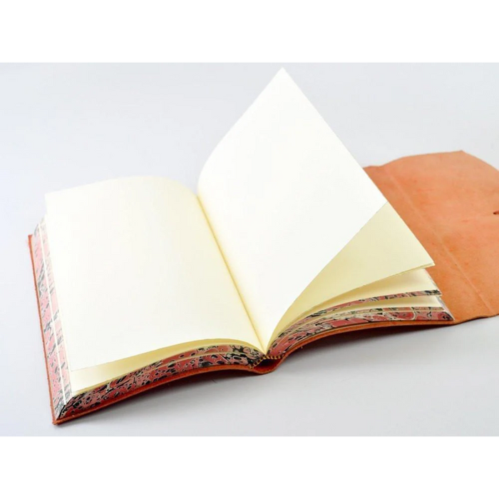 Edges are beautifully marbled, leather thong wraps journal flap to secure it closed. There are 416 cream-laid, unlined pages (208 sheets). This is a thick journal- a commitment for some of us, but a welcome receptacle for those whose writing flows.