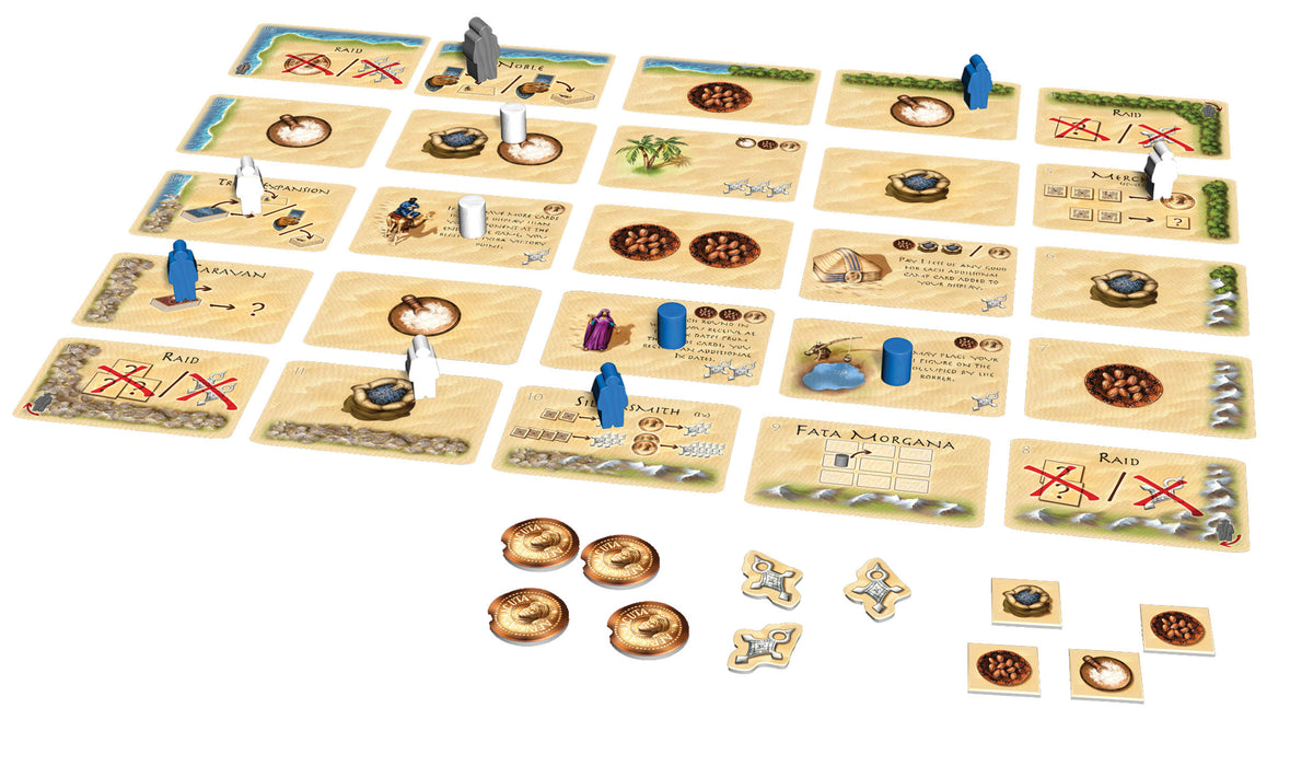 A Targi is a male member of the Tuareg people, who live in the Sahara desert. As tribe leader, you will be trading dates, salt, and pepper to obtain coveted gold coins and advantages. In the game, the desert is a five-by-five grid of cards. Position your Targi figures on the cards that border the desert. You carry out the actions of those cards as well as the cards at the crossroads between them. If you don’t go to the merchant, you won’t be able to trade — and even worse, your opponent will. Or maybe a caravan will bring the merchandise you desire. There are many choices to consider. But don’t wait too long, the desert is harsh and you might miss an opportunity to make a deal. In the next round, a completely different set of offerings will be on the table. The goods cards are the means to the end of getting highly desired tribe cards. These in turn bring advantages during the game and victory points at the end. You can win only if you plan shrewdly and always keep some gold in your pocket.