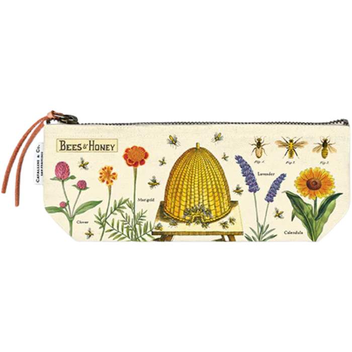 Cavallini & Co. Bees and Honey Mini Pouches feature some of their wonderful bees and flowers images! Colorful bees, hives, and flowers adorn this mini pouch- smaller the full size Vintage Canvas Pouches, and perfect for carrying pens and pencils anywhere you go. 100% natural cotton bags are lined and have gusseted bottoms to stand on their own. Or use it as a travel bag for overnight supplies- it is the perfect size for your toothbrush and toothpaste!