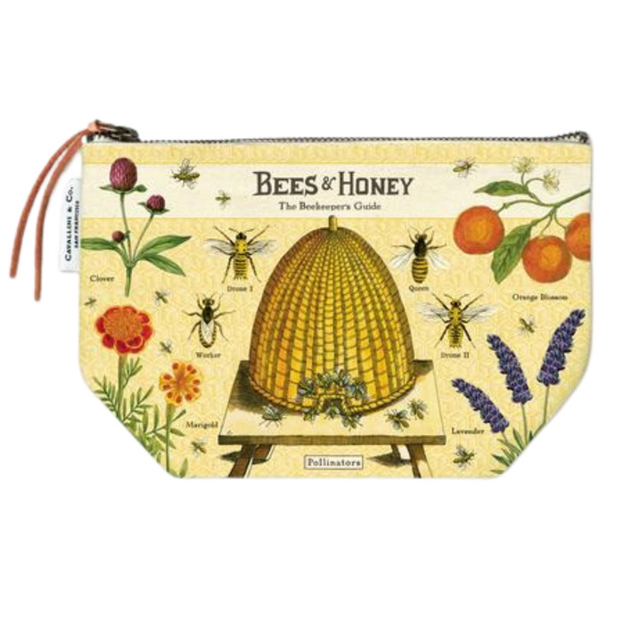 Cavallini & Co. Bees and Honey Pouches feature some of their wonderful bee and flower images! Colorful bees, hives, and flowers adorn this full size Vintage Canvas Pouch. Perfect for carrying pens and pencils, art supplies, or just about anything.