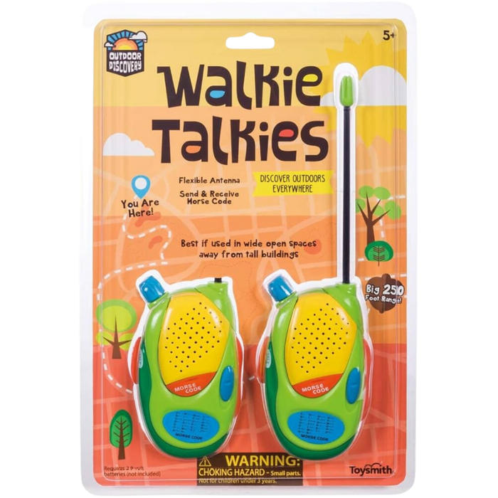 Add excitement to playtime indoors or outdoors! These walkie talkies are 4 1/2" Tall (Not including antenna), and feature volume control and morse code. They have a big 250 foot range! Requires two 9V batteries (not included). Recommended for age 5 years and up.
