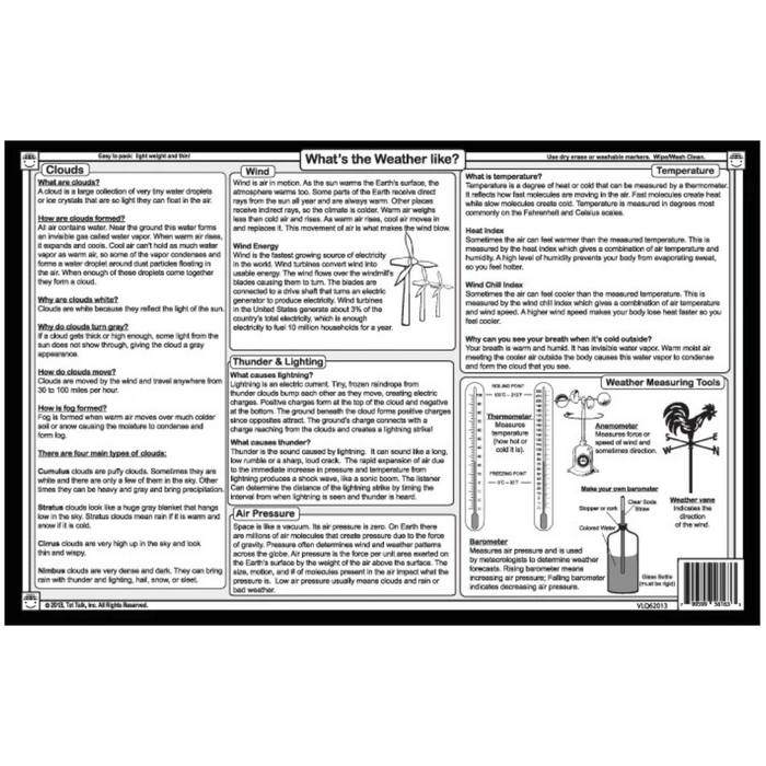 Thunder and lightning, wind, pressure and clouds are interesting phenomenon and Tot Talk's weather placemat has a graphical display to engage the youngest! How does our water cycle work? How do we measure temperature and pressure? What is pressure? Children will be engaged at the table with sun or rain outside the window learning about weather.
