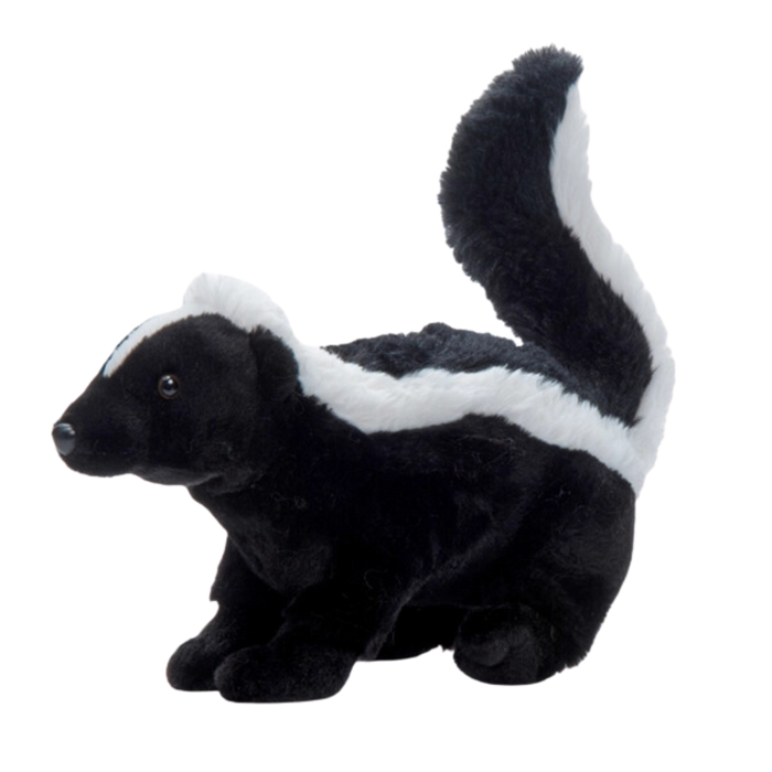 Sly and clever, 12" huggable, stuffed skunk animal plush loves sharing adventures. Made with high quality fabric and durable stitching, this child’s skunk toy is designed to last through years of play