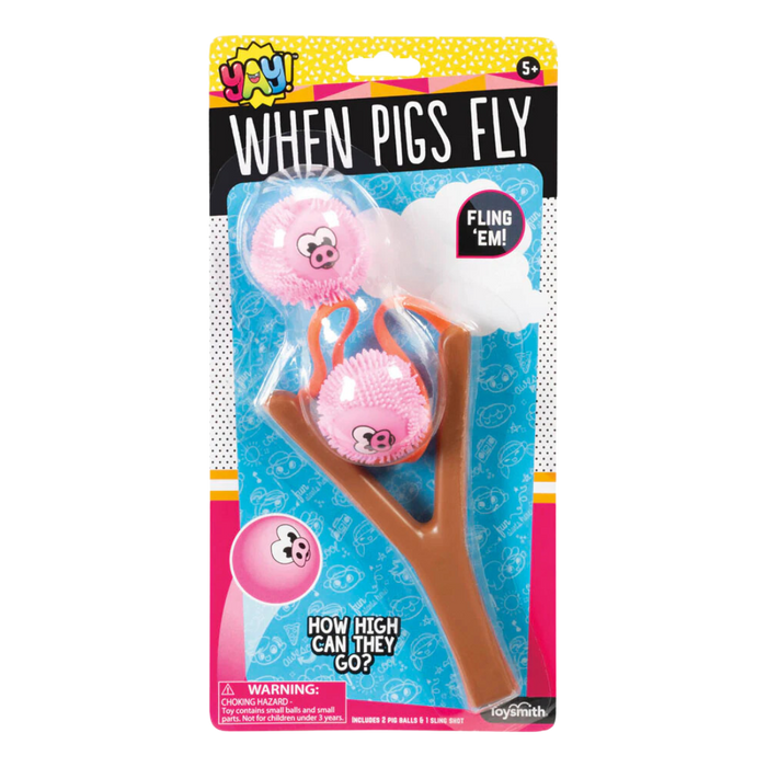 The YAY! When Pigs Fly slingshot sells out quickly. Each peggable packet includes 1 brown plastic 7-inch slingshot with a connected orange rubber band, and 2 pig-themed pink 2-inch squish balls. The tiny pig-inspired launch balls are made with soft, nontoxic plastic. Each one is light pink and features a cartoon pig face with wide eyes and a snout. Balls also feature textured bodies with small nubs for enjoyable tactile sensations.